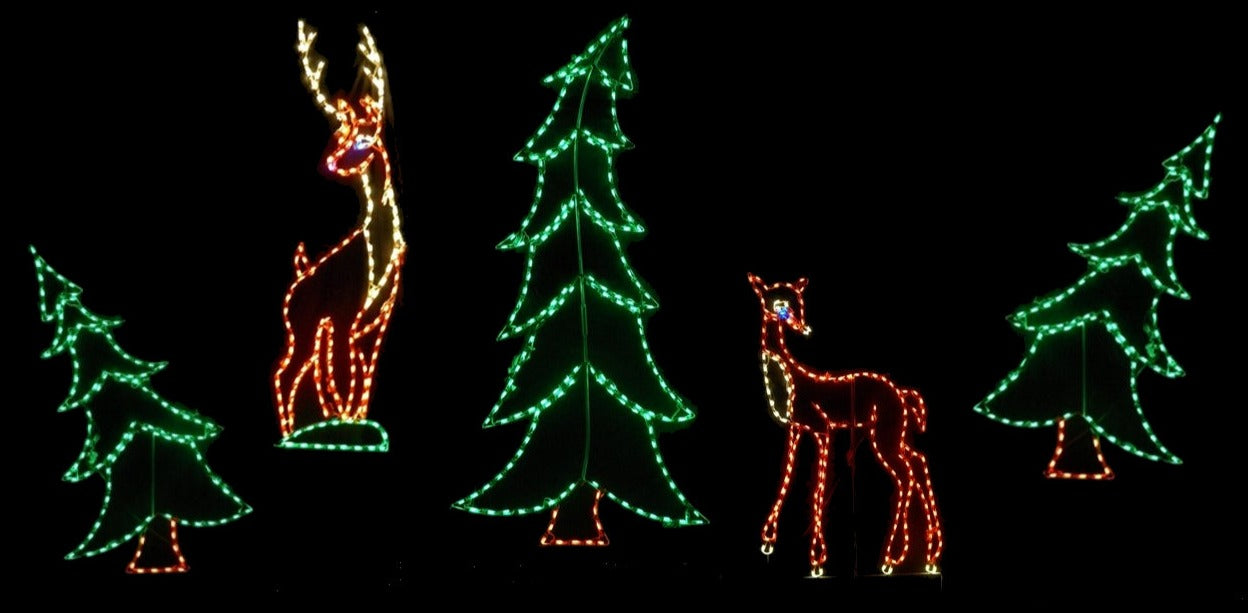 Lit with LED M5 mini lights - will brighten your holidays! Buck measures 84"T x 27"W (including ground stakes) Doe measures 36"T x 62"W (including ground stakes) Small Tree Measures 68"T x 30"W (including ground stakes) Large Tree Measures 88"T x 39"W (including ground stakes)