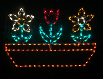 Spring-inspired flower pot! This pretty piece measures 34" T x 43"W (including ground stakes) Lit with 170 LED M5 Mini Lights.
