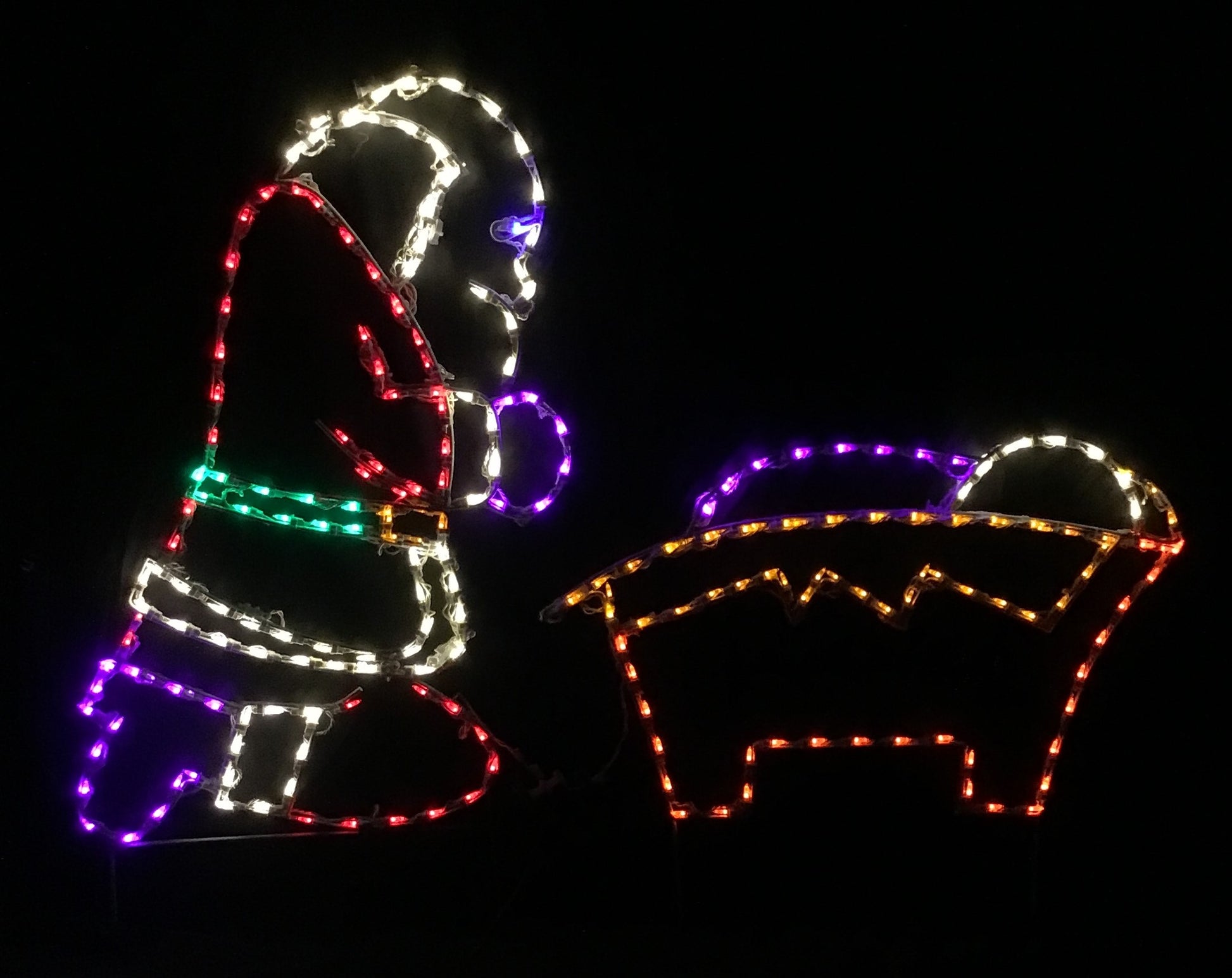 Beautiful addition to any holiday display! Santa measures 47" T x 26" W, Jesus in cradle 28" T x 36" W (including ground stakes). Frames are 1/4" round steel painted with gloss white Rust-Oleum and lit with LED M5 mini lights. Perfect way to show your love of the season.